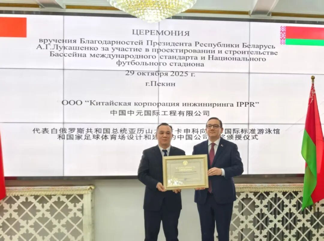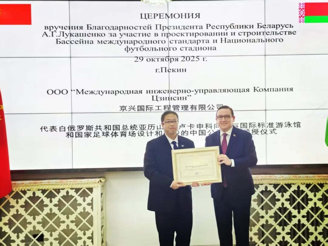 10月29日,白俄羅斯總統(tǒng)嘉獎(jiǎng)?lì)C授儀式在白駐華使館舉行。中國(guó)中元、所屬京興國(guó)際作為援白俄羅斯國(guó)家足球體育場(chǎng)項(xiàng)目的設(shè)計(jì)與項(xiàng)目管理單位,憑借卓越的工程設(shè)計(jì)與項(xiàng)目管理能力,榮獲盧卡申科總統(tǒng)簽字簽署的嘉獎(jiǎng)令。白俄羅斯總統(tǒng)辦公廳第一副主任弗拉基米爾·鮑里索維奇·佩爾采夫、駐華大使亞歷山大·維克托羅維奇·切爾維亞科夫共同為獲獎(jiǎng)單位頒發(fā)榮譽(yù)。